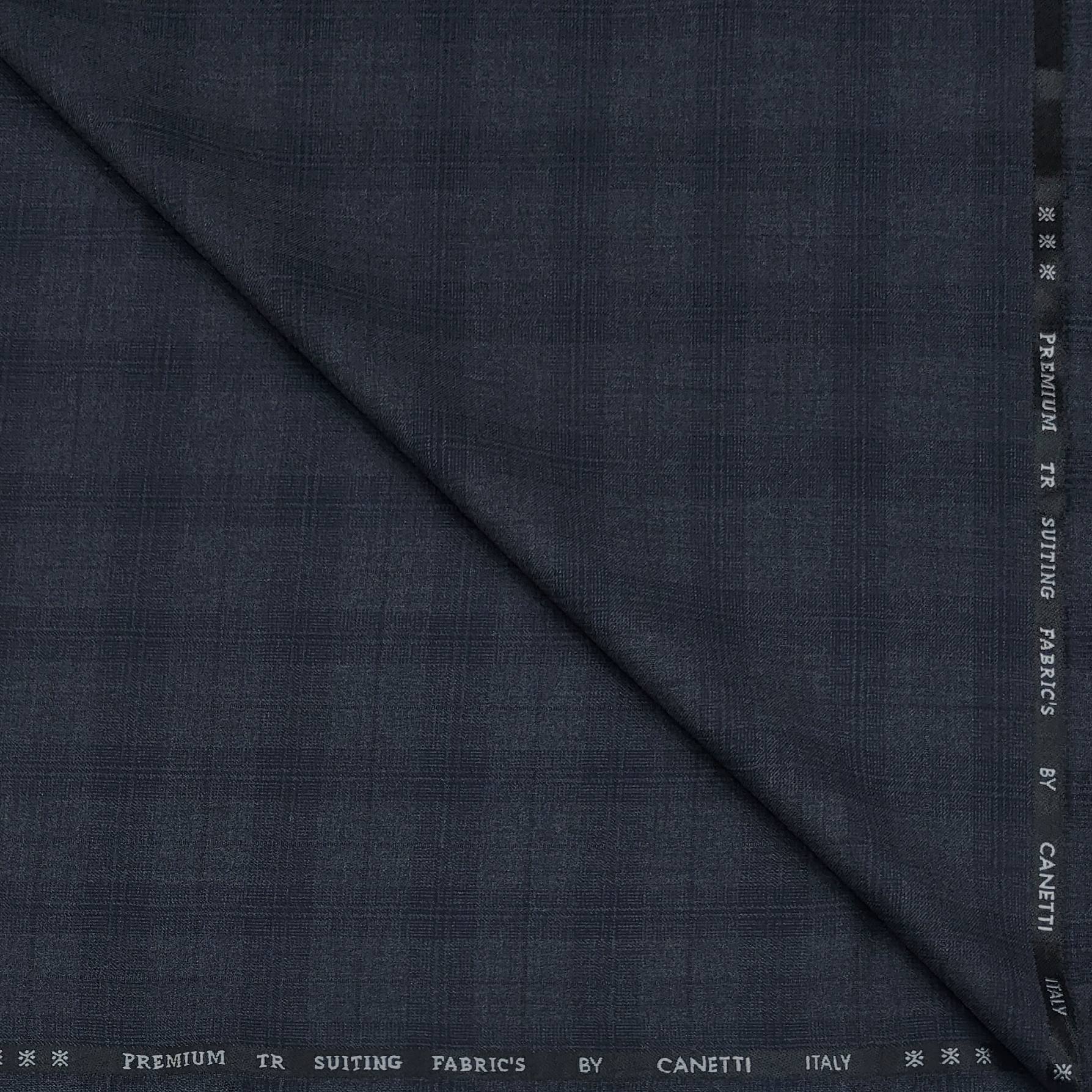 This luxurious Canetti trouser fabric from Italy features a broad check design in a sophisticated greyish blue color. Made from premium quality materials, it is perfect for men's formal and party wear, as well as wedding attire. Elevate your style with this high-quality and fashionable trouser fabric.