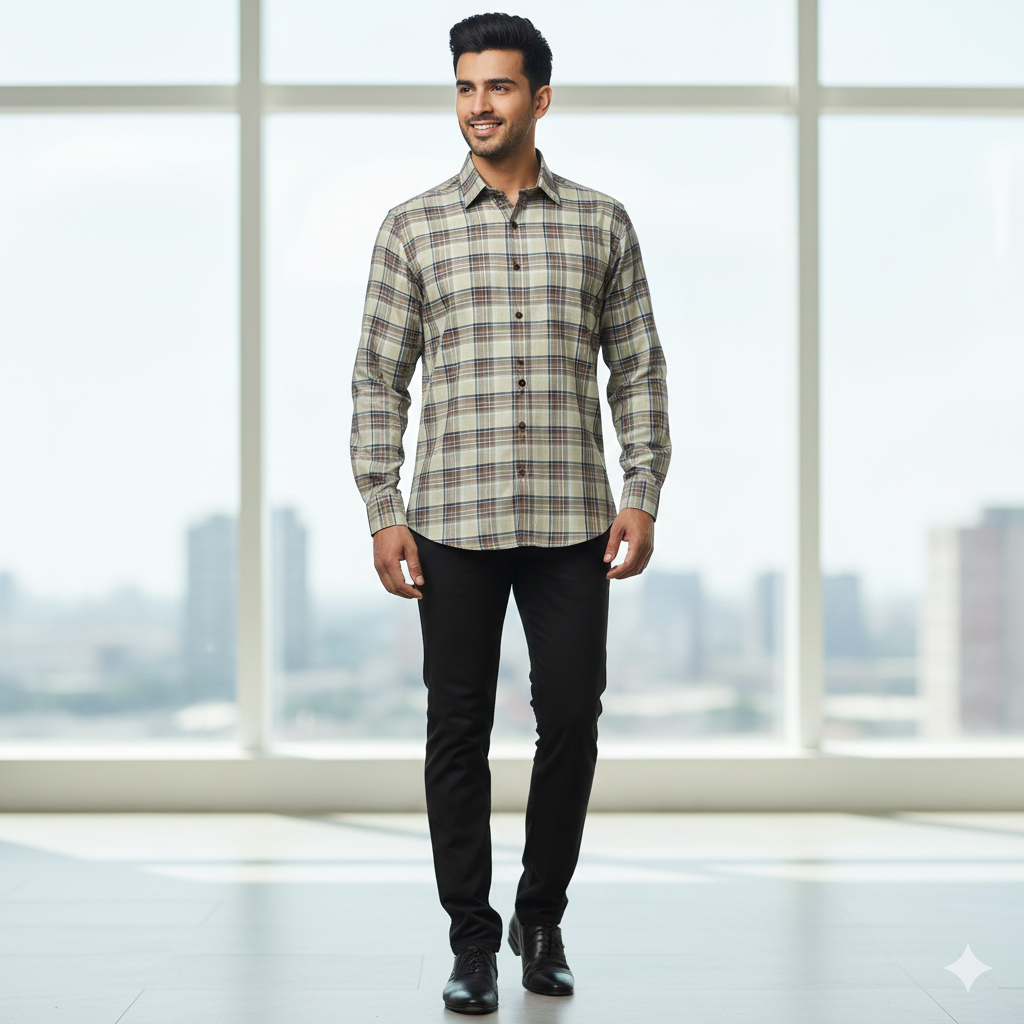 Shirt Fabric Donear Premium Giza Cotton Broad Check Colour Beige N Tan Brown
