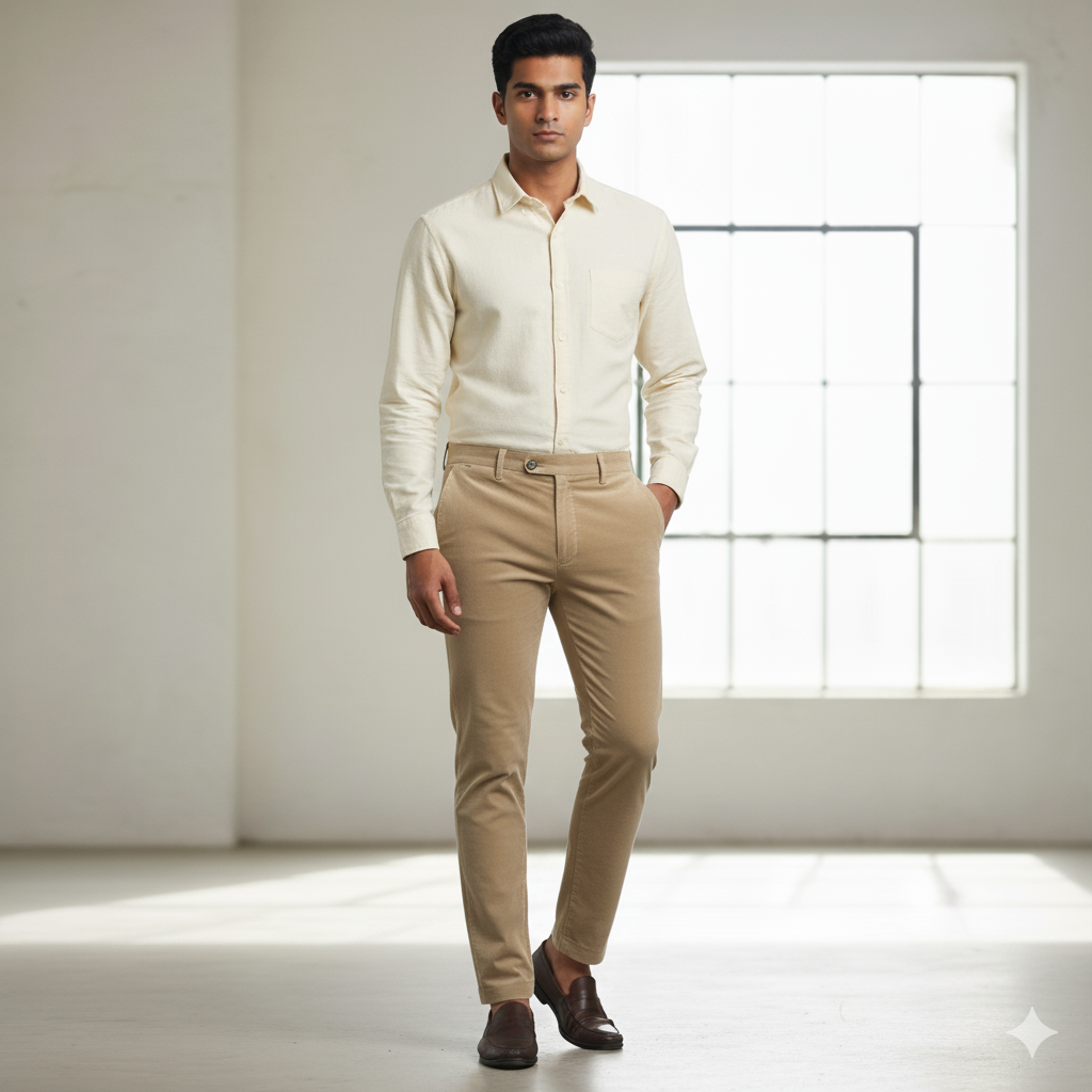 "Upgrade your formal wardrobe with our Ash Brown Corduroy Arvind Trouser Fabric. Made with premium quality, stretchable Arvind cotton, this luxury fabric adds a touch of elegance to your attire. Perfect for parties, weddings, or everyday wear. Get ready to turn heads!"