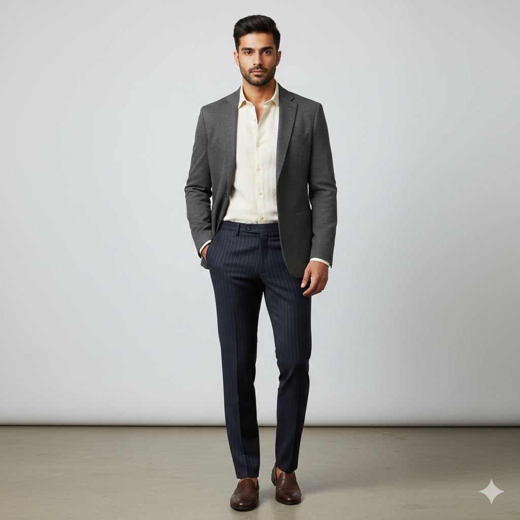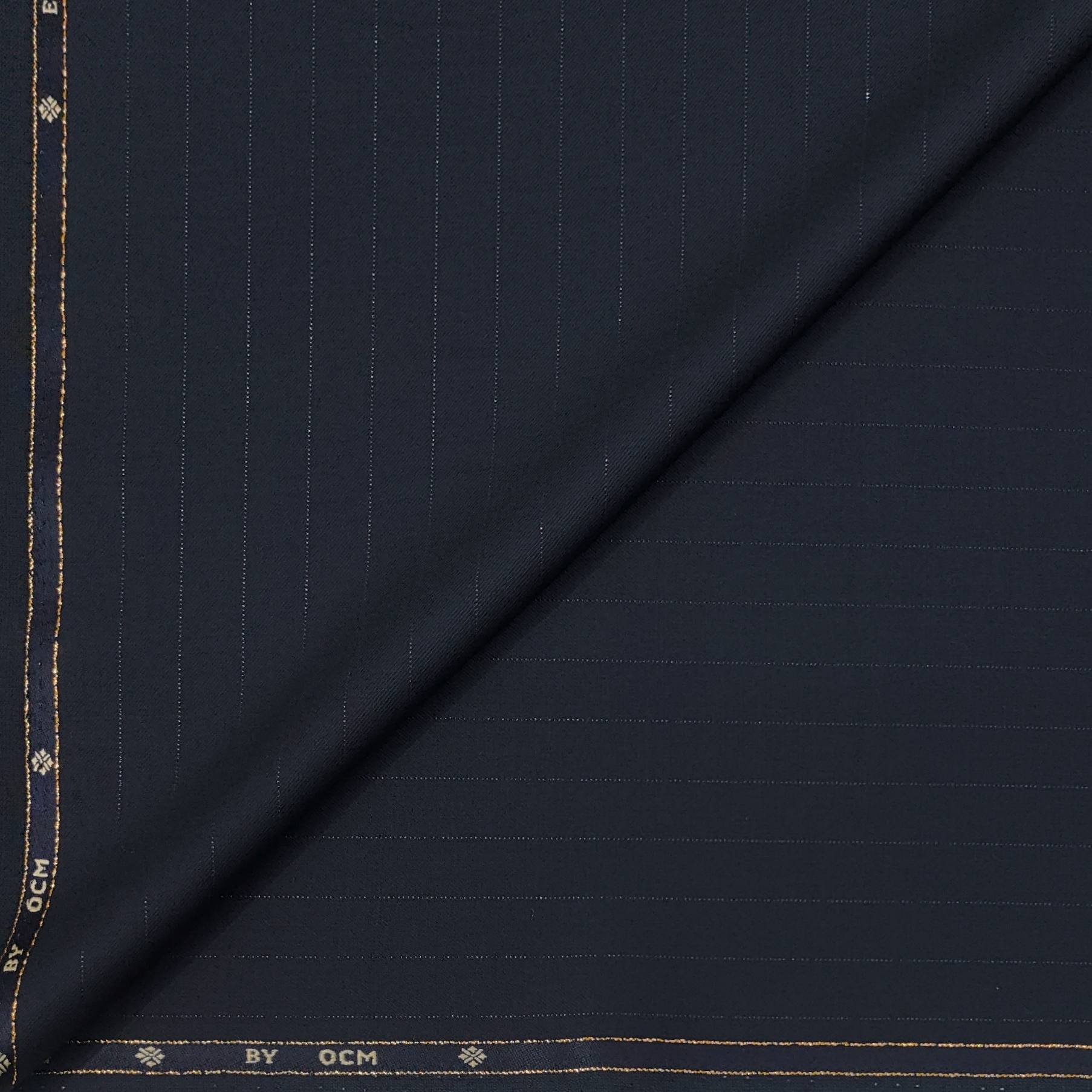Elevate your sartorial experience with the OCM Super 130s wool blended trouser fabric in an exquisite dark blue hue. Meticulously crafted for discerning gentlemen, this premium textile embodies sophistication, seamlessly transitioning from formal affairs to celebratory events. Indulge in unparalleled luxury—where craftsmanship meets elegance in every thread.