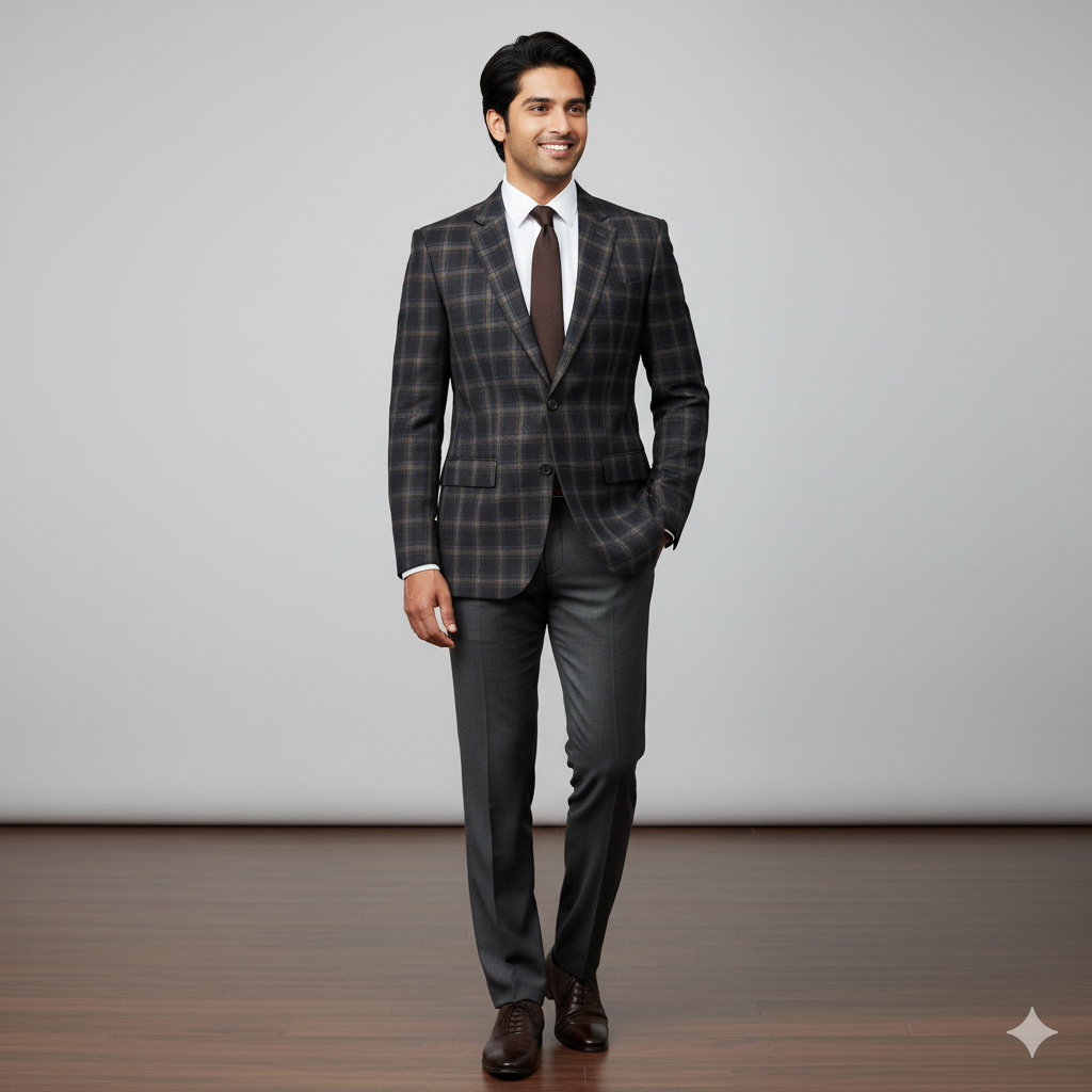Elevate your style with our OCM Super Fine count 100% Wool Check Blazer Fabric. Made with premium quality, luxurious Grado wool, this men's blazer is perfect for any occasion. Its elegant check pattern in charcoal grey and light brown adds a touch of sophistication to any outfit.