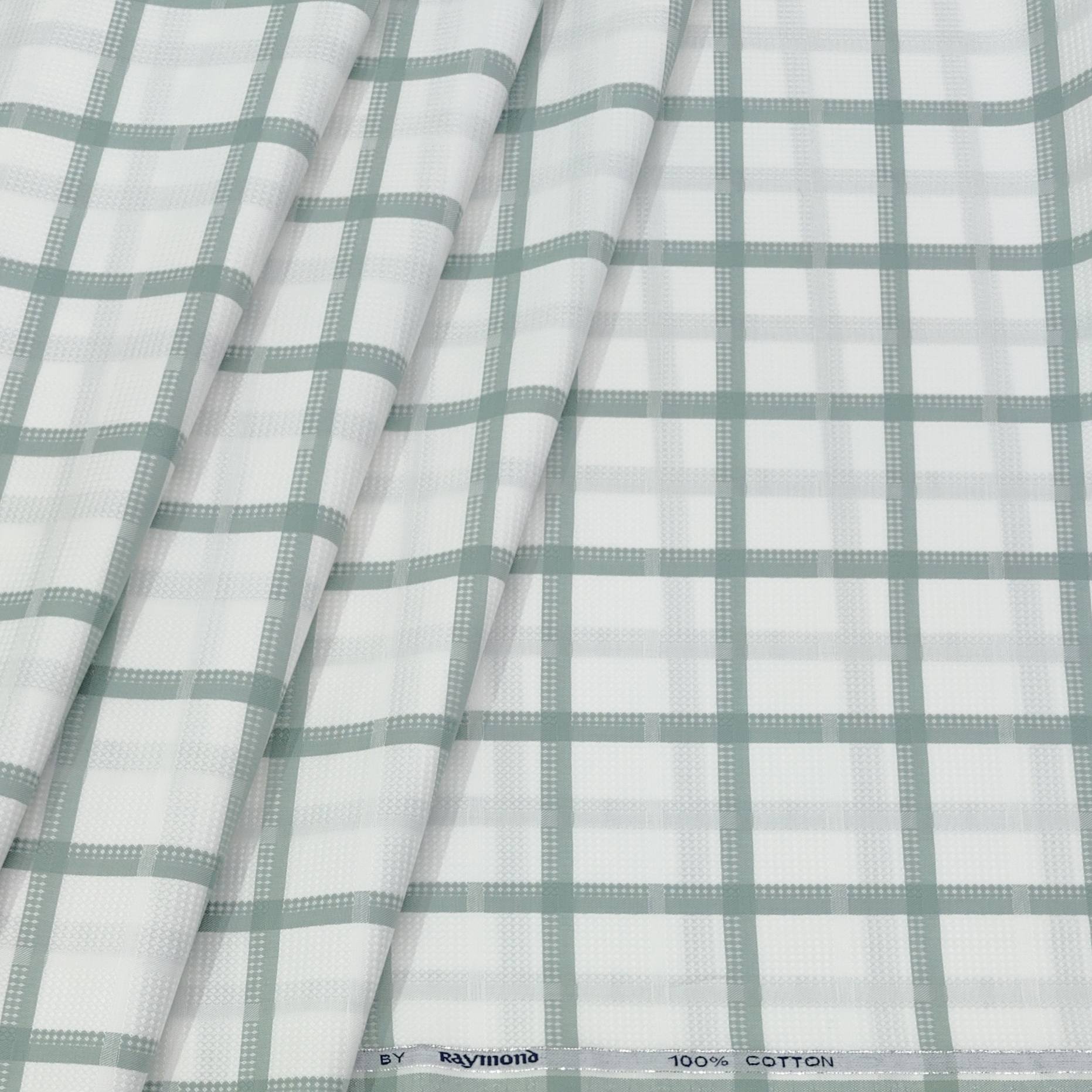 Upgrade your wardrobe with our Raymond 100% Premium Cotton Broad Check Shirt Fabric in a stylish green and white color. Made with luxury and premium quality in mind, this fabric is perfect for both formal and party wear. Experience the comfort and good look of pure cotton in this men's wedding shirt fabric.