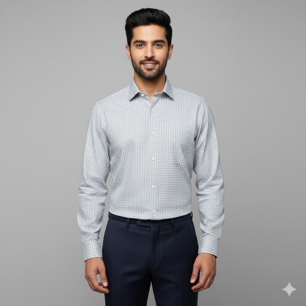 Experience the ultimate luxury in men's formal wear with our Grasim 100% Cotton Small Check Shirt Fabric. This premium quality fabric boasts a silver grey color and a small check pattern, perfect for both party wear and weddings. Trust in the pure cotton material for a comfortable and stylish look.