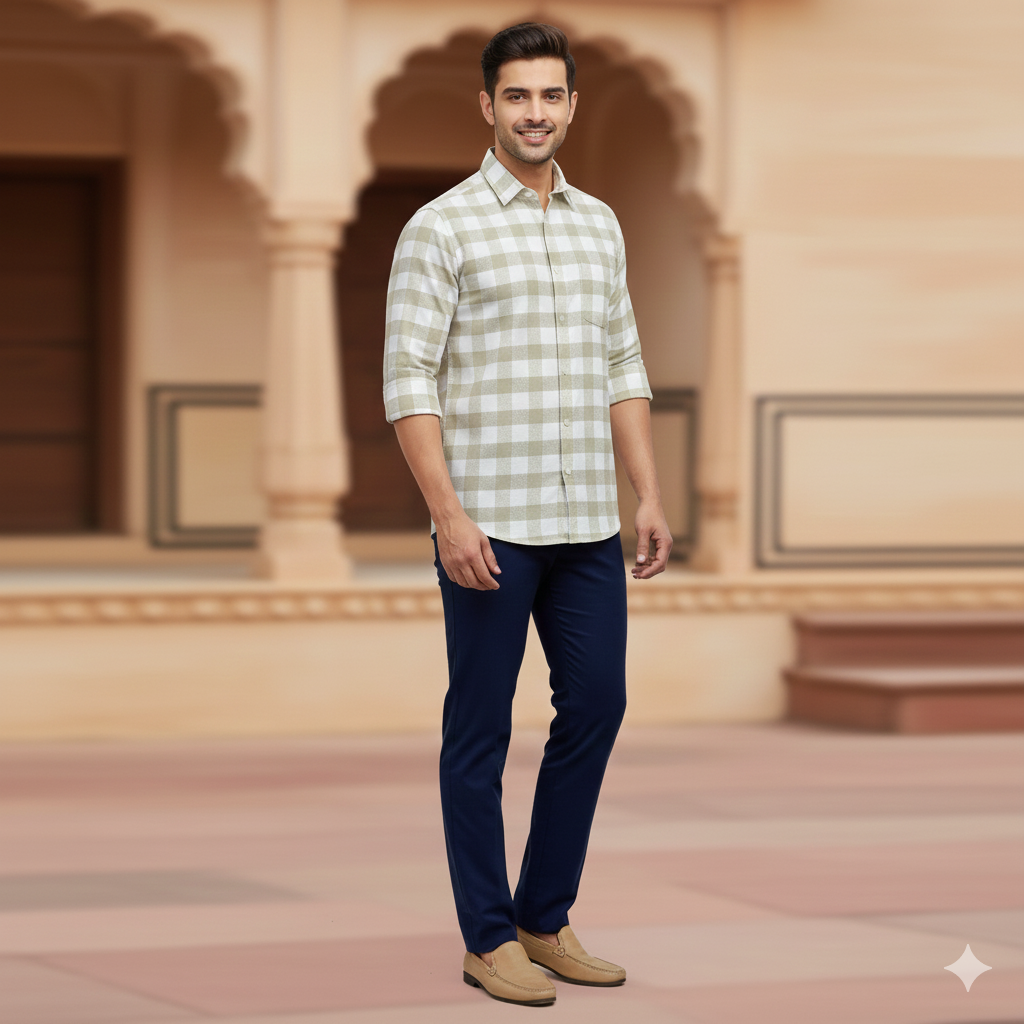 Elevate your shirt game with Soktas Finest 100% Cotton Fabric. This luxury fabric is made from pure Giza cotton, ensuring premium quality. Perfect for formal occasions or parties, this sand brown and white check pattern adds a touch of sophistication to any men's shirt. (No, it's not just for weddings.)