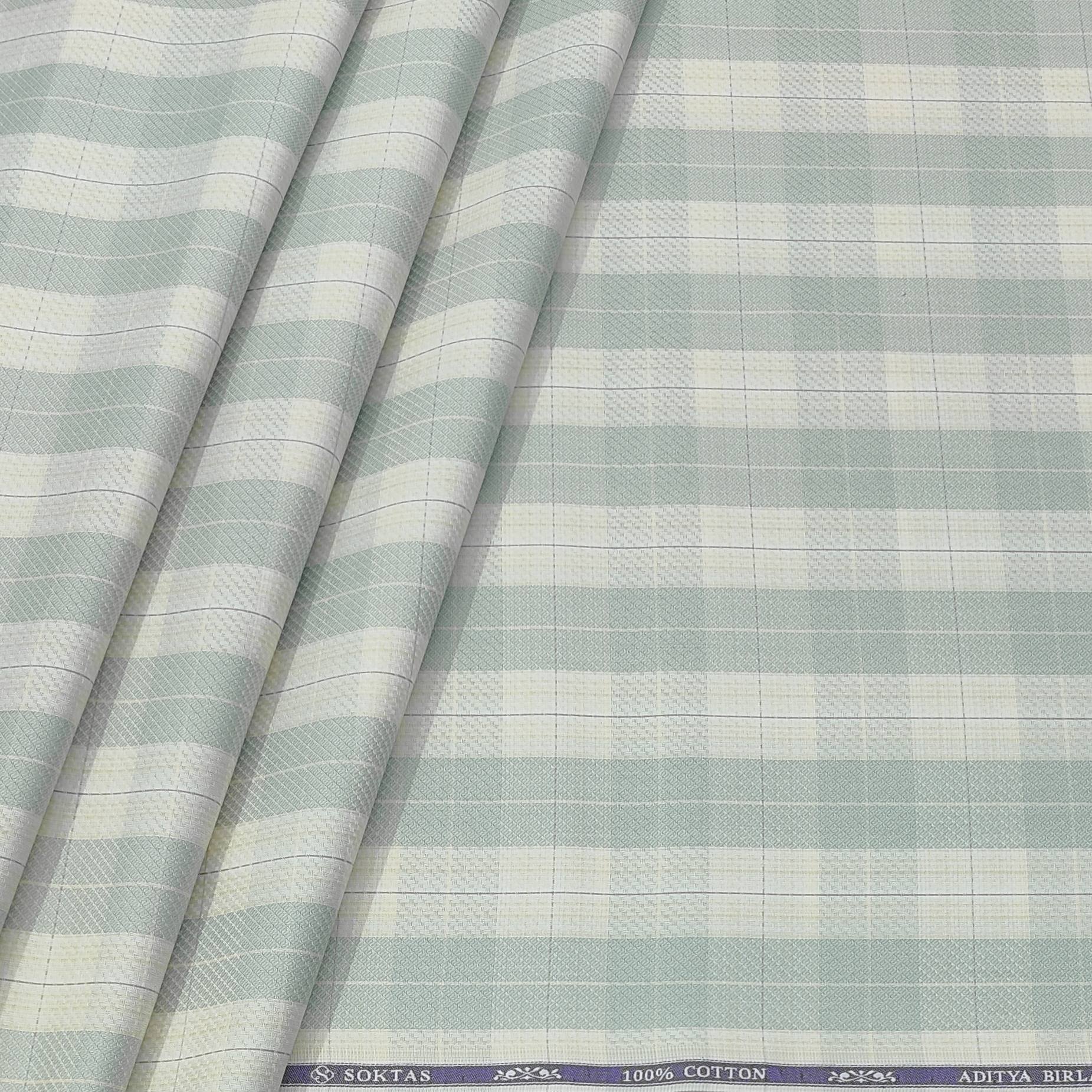 Indulge in the finest quality with Soktas shirt fabric. Made from luxurious Giza cotton, this fabric is perfect for men's formal and party wear. With a classic check pattern in beige and light green, this fabric exudes sophistication and elegance. Elevate your wardrobe with this premium and exclusive shirt fabric.