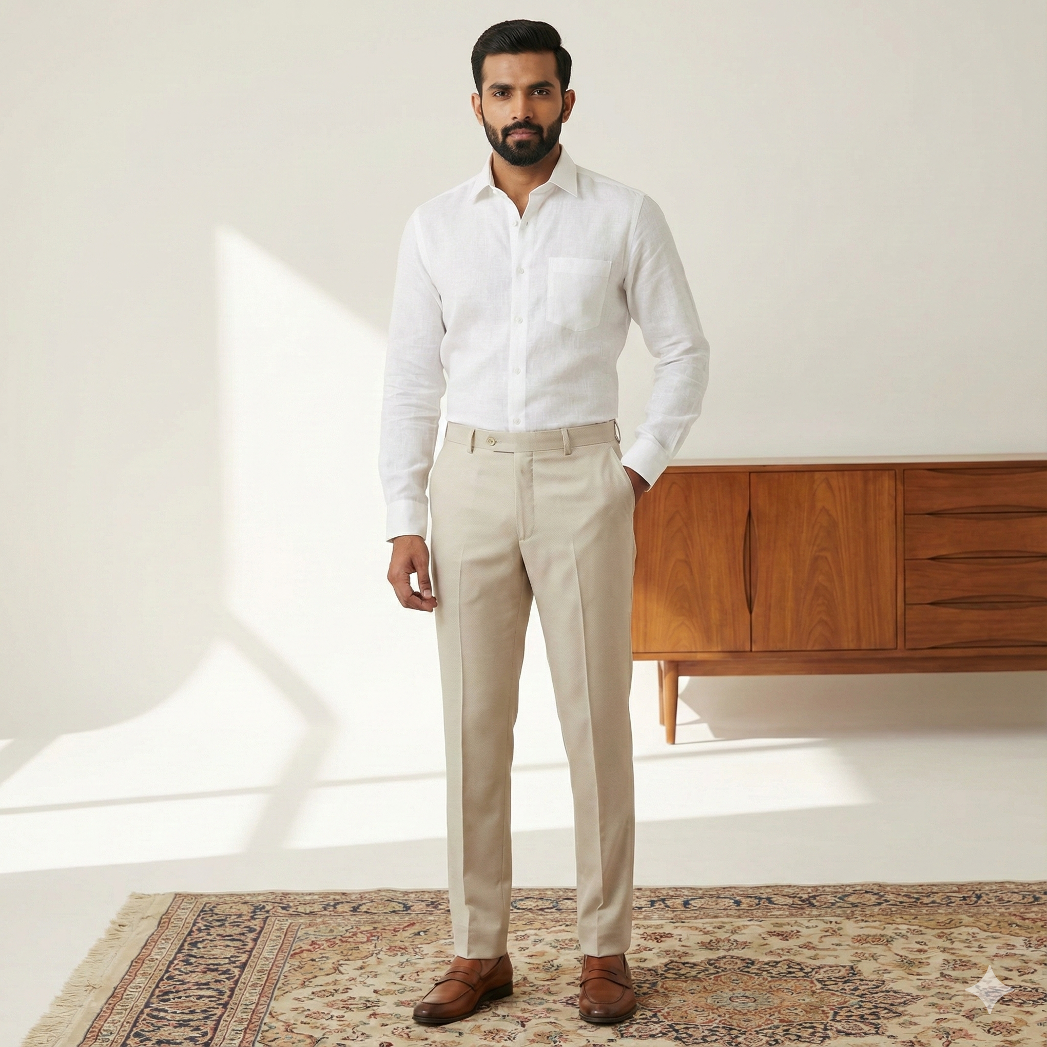 "Upgrade your trouser game with Canetti Italy Luxury 100s Wool Blended Dobby Fabric in Cream. Perfect for formal occasions, weddings, and parties, this premium quality fabric offers a luxurious touch while keeping you comfortable with its wool blend. Don't settle for less, choose Canetti."